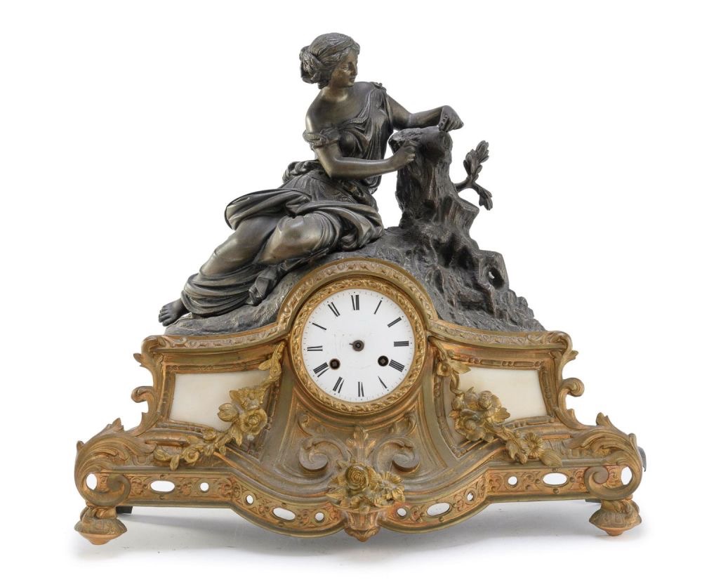 Orologio da tavolo in metallo dorato e brunito, con scultura superiore a figura di fanciulla vicino ad un tronco. Base dorata a ricamo fiorito con inserti in alabastro. Dimensioni: 43 x 45 x 18 cm. Anno fine XIX secolo.