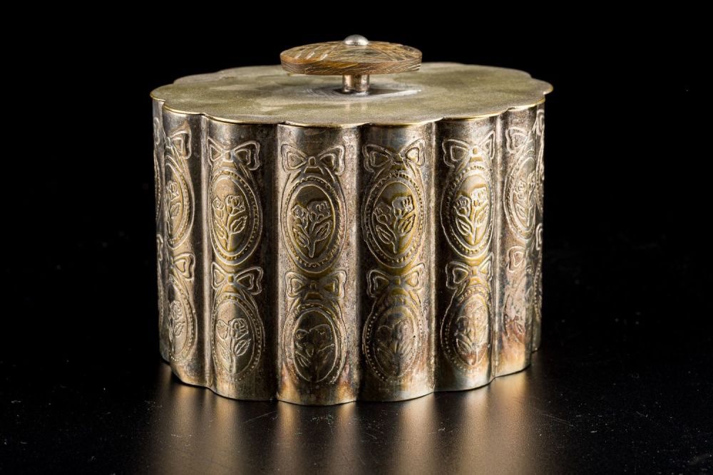 Porta Tè in Sheffield con pomello in legno, manifattura inglese. Dimensione: 8 x12 x 10 cm. Anno XX secolo, marchio inciso sul fondo