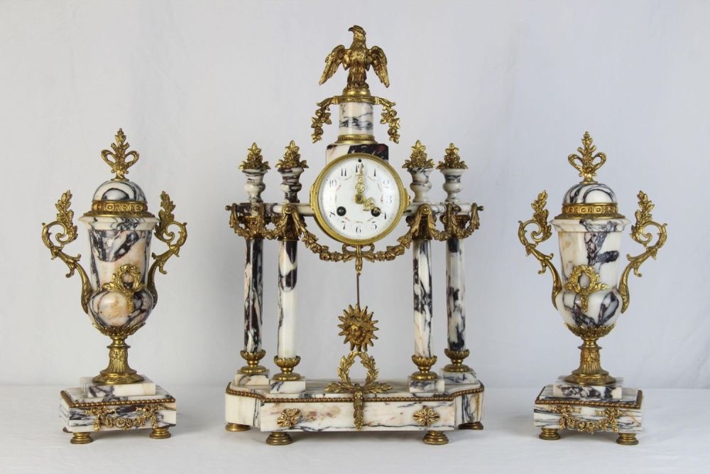 Trittico da camino in marmo bianco venato composto da orologio sostenuto da quattro colonne decorate da bronzi cesellati sulla sommità un'aquila, con ali spiegate. Coppia di vasi con coperchio. Dimensioni: Orologio cm. 48 x 32 x 18h. Vasi cm. 36 x 18 x 10.